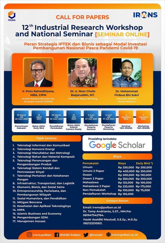 BANDUNG, polban.ac.id – IRWNS ke 12 kali ini mengusung tema “Peran Strategis IPTEK dan Bisnis sebagai Modal Investasi Pembangunan Nasional Pasca Pandemi Covid-19” . Informasi lengkap silakan kunjungi laman IRWNS.