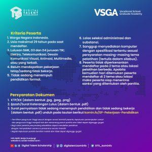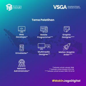Pelatihan VSGA membuka pendaftaran mulai 11 Agustus 2020 dengan 7 tema pelatihan. Pelatihan ini diperuntukkan bagi Lulusan SMK, D3 dan D4 jurusan TIK, Elektro, Telekomunikasi, Desain Komunikasi Visual, Animasi, Multimedia, atau yang terkait; sedangkan pelatihan FGA membuka pendaftaran mulai 14 Agustus 2020 dengan 7 tema pelatihan, diperuntukan bagi Lulusan D3, D4, atau Strata-1 yang terkait terkait dalam bidang TIK, MIPA, dan Teknik lainnya.