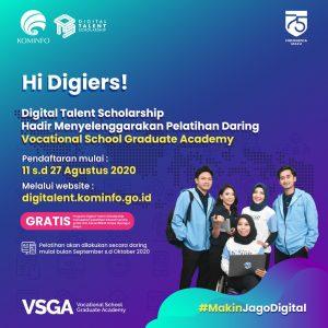 VSGA dan FGA merupakan bagian dari Program Digital Talent Scholarship 2020. Setiap peserta terpilih berkesempatan mengikuti pelatihan dan sertifikasi untuk meningkatkan keterampilan di bidang IT. Pelaksanaan VSGA bekerja sama dengan Unit Pelaksana Teknis Kementerian Kominfo dan Mitra Perguruan Tinggi ternama yang tersebar di seluruh Indonesia serta didukung oleh Global Technology Companies untuk FGA. Tahun ini, beradaptasi dengan kebiasaan baru, VSGA dan FGA berlangsung dalam jaringan (online). Materi pelatihan yang diberikan terdiri dari technical skills dan soft skills development.