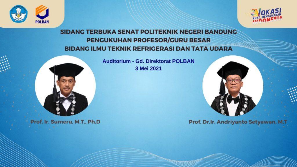 BANDUNG, polban.ac.id – Pada hari ini tanggal 3 Mei 2021 Direktur Politeknik Negeri Bandung mengukuhkan 2 guru besar bidang Ilmu Teknik Refrigerasi dan Tata Udara. Segenap sivitas akademika Politeknik Negeri Bandung mengucapkan selamat dan sukses kepada Bapak Prof. Ir. Sumeru, M.T., P.Hd. dan Bapak Prof. Dr. Ir. Andriyanto Setyawan, M.T.. Dengan adanya pengukuhan hari ini maka Guru Besar/Profesor di Politeknik Negeri Bandung bertambah menjadi 4 orang.
