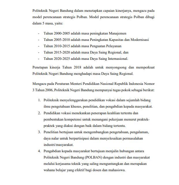 BANDUNG, polban.ac.id - Politeknik Negeri Bandung dalam menetapkan capaian kinerjanya, mengacu pada model perencanaan strategis Polban. Model perencanaan strategis Polban dibagi dalam 5 masa, yaitu: